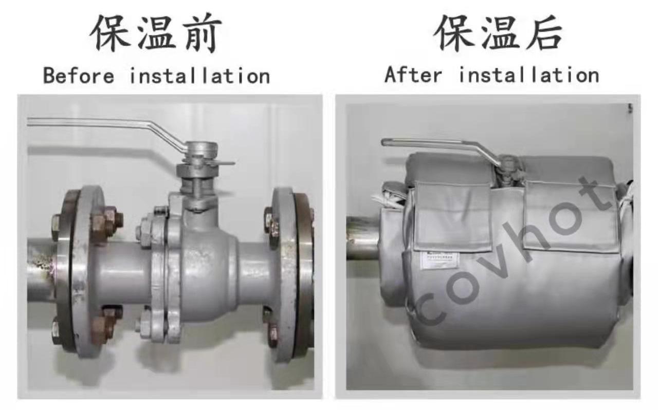 例:以一個(gè)DN100的法蘭式截止閥在蒸汽溫度110℃的管線上,如果不做保溫,一年會(huì)造成10.4噸的蒸汽損失。以蒸汽成本200元/噸計(jì)算,僅僅散熱損失就達(dá)2080元/年。如果安裝covhot柔性可拆卸保溫套(3cm厚度玻璃纖維保溫材料)以后,減少熱損失4噸/年,也就是800元/年。從這個(gè)例子可以很明顯的看出安裝可拆卸保溫套的保溫隔熱效果以及節(jié)能價(jià)值。