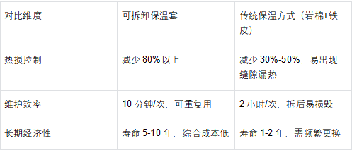 從數(shù)據(jù)可見,可拆卸保溫套不僅能解決傳統(tǒng)保溫的“熱損高、維護(hù)難”痛點(diǎn),更能通過長期耐用性降低綜合成本,投資回報(bào)周期普遍不超過8個(gè)月,之后每年都能為企業(yè)帶來穩(wěn)定的節(jié)能收益。