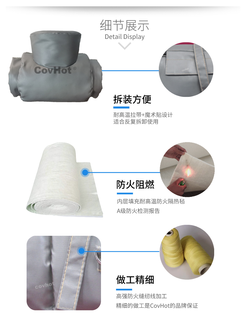閥門內(nèi)部介質(zhì)通常為各種化工原料,柔性可拆卸閥門保溫套使用的材料可防火阻燃,能夠有效防止因介質(zhì)泄露引起的火災(zāi) ,另外閥門運行時溫度較高,易受熱膨脹,“披覆保溫”原材料柔韌性較好,能夠?qū)﹂y門的膨脹進行補償,不會出現(xiàn)保溫性能下降現(xiàn)象,有利于閥門機組安全運行,大大提高設(shè)備運轉(zhuǎn)率,增加經(jīng)濟效益;